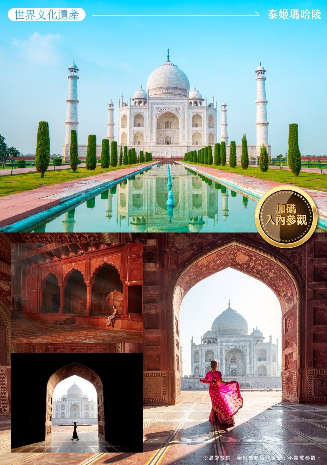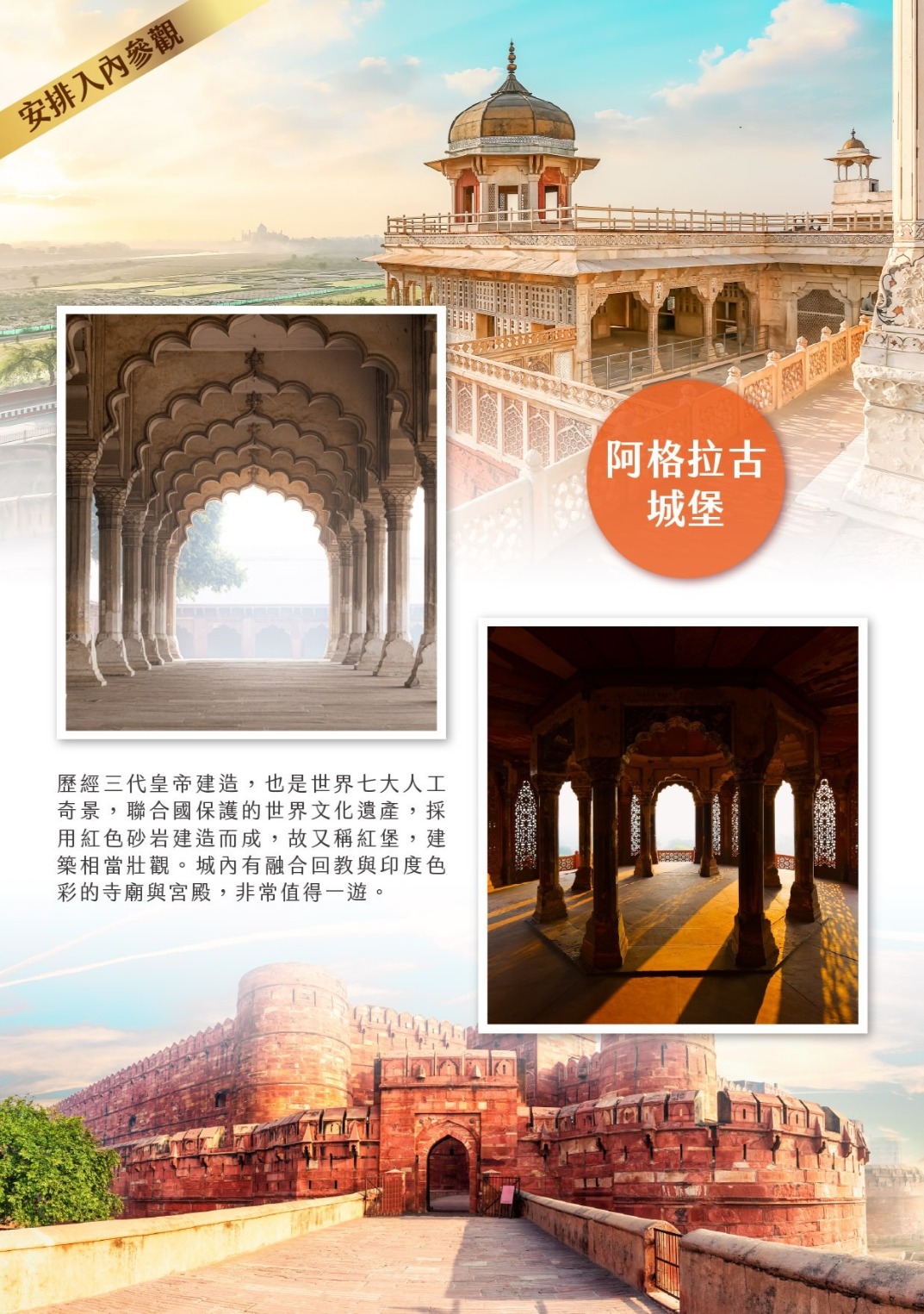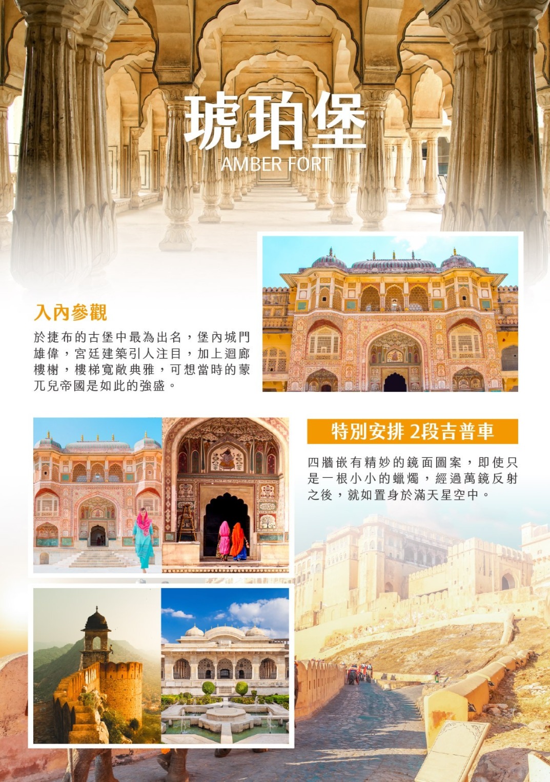 於捷布的古堡中最為出名,特別安排★2段吉普車,堡內城門雄偉,宮廷建築引人注目,加上迴廊樓榭,樓梯寬敞典雅,可想當時的蒙兀兒帝國是如此的強盛。鏡宮,四牆嵌有精妙的鏡面圖案,即使只是一根小小的蠟燭,經過萬鏡反射之後,就如置身於滿天星空中。