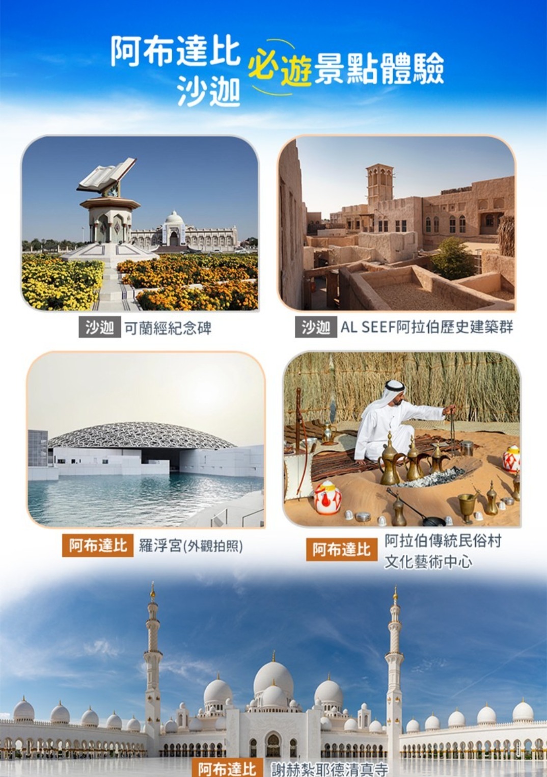 杜拜-阿布達比-謝赫紮耶德清真寺-盧浮宮(外觀拍照)-阿拉伯傳統民俗村-阿拉伯文化藝術中心-北京(轉機點)-