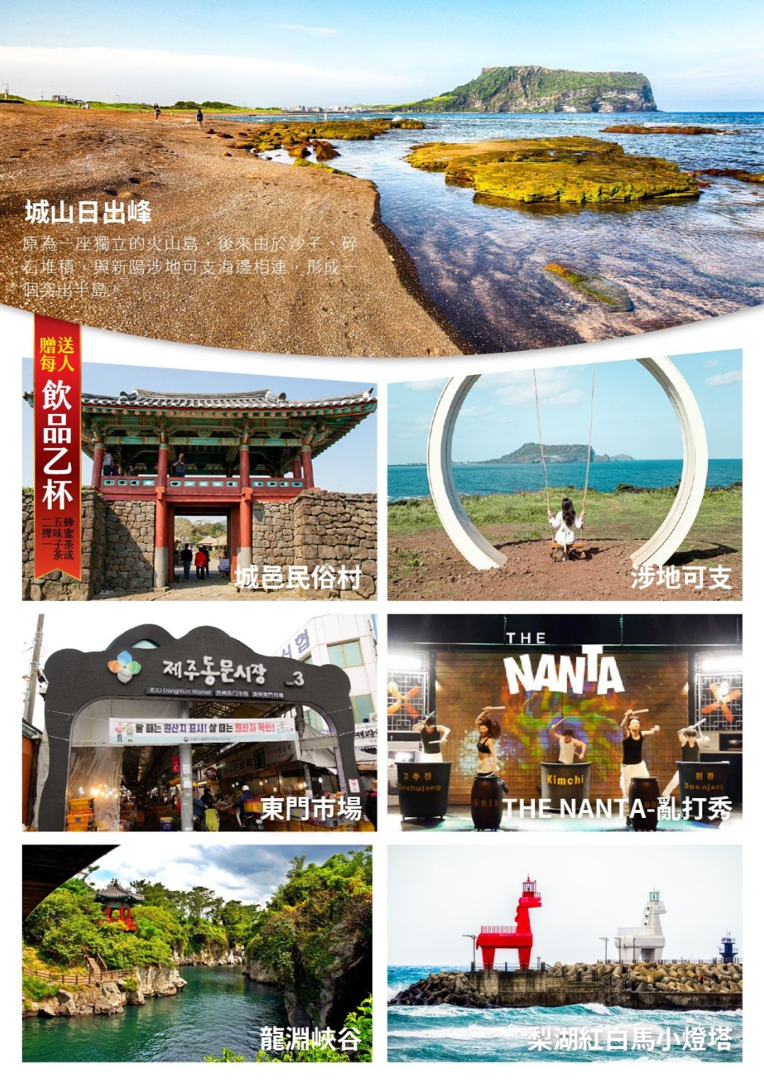 飯店→思連伊林蔭道→城山日出峰→涉地可支→城邑民俗村(贈送每人一杯蜂蜜茶或五味子茶二選一) →濟州橘子園(濟州風味巧克力試吃)→樂天免稅店→飯店-