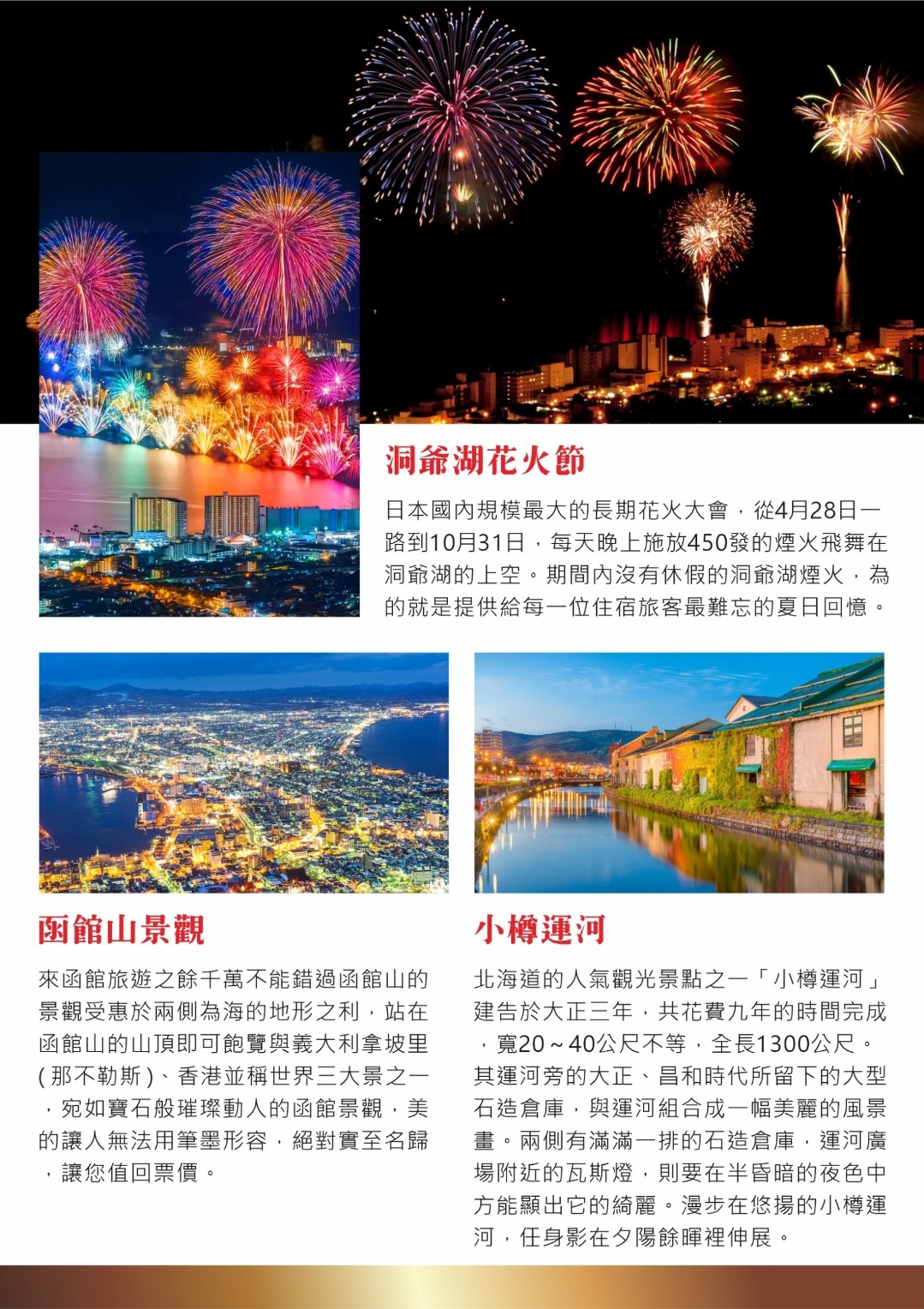 來函館旅遊之餘千萬不能錯過函館山的景觀受惠於兩側為海的地形之利,站在函館山的山頂即可飽覽與義大利拿坡里(那不勒斯)、香港並稱世界三大景之一,宛如寶石般璀璨動人的函館景觀,美的讓人無法用筆墨形容,絕對實至名歸,讓您值回票價。