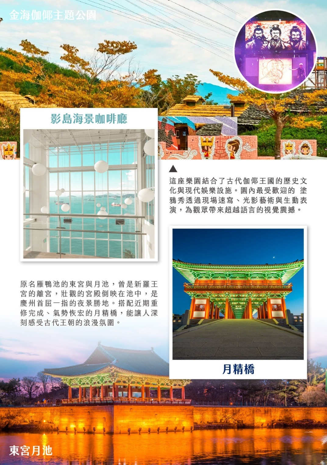 飯店→白淺灘文化村→國立海洋博物館→影島【THRILL ON THE MUG】海景咖啡廳(飲料自理)→金海伽倻主題公園+賞花季+加耶王國主題塗鴉秀→海雲台THE BAY101+海雲台市場-