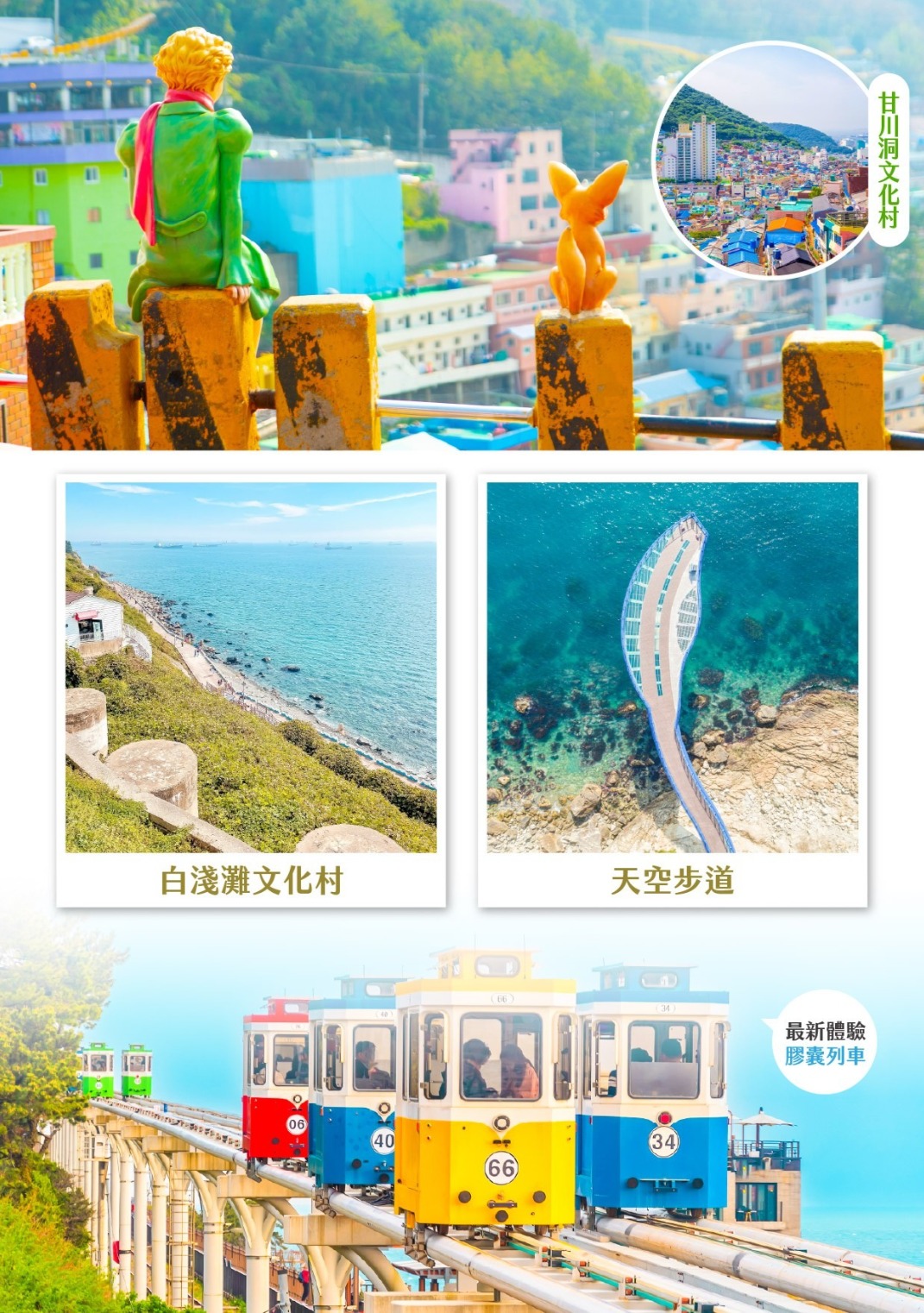 飯店→精緻美膚彩妝坊→甘川洞文化村~彩繪壁畫村→韓國土產專門店→必去景點~BLUE LINE PARK 膠囊列車→青沙浦天空步道→釜山樂天 OUT LET→飯店-