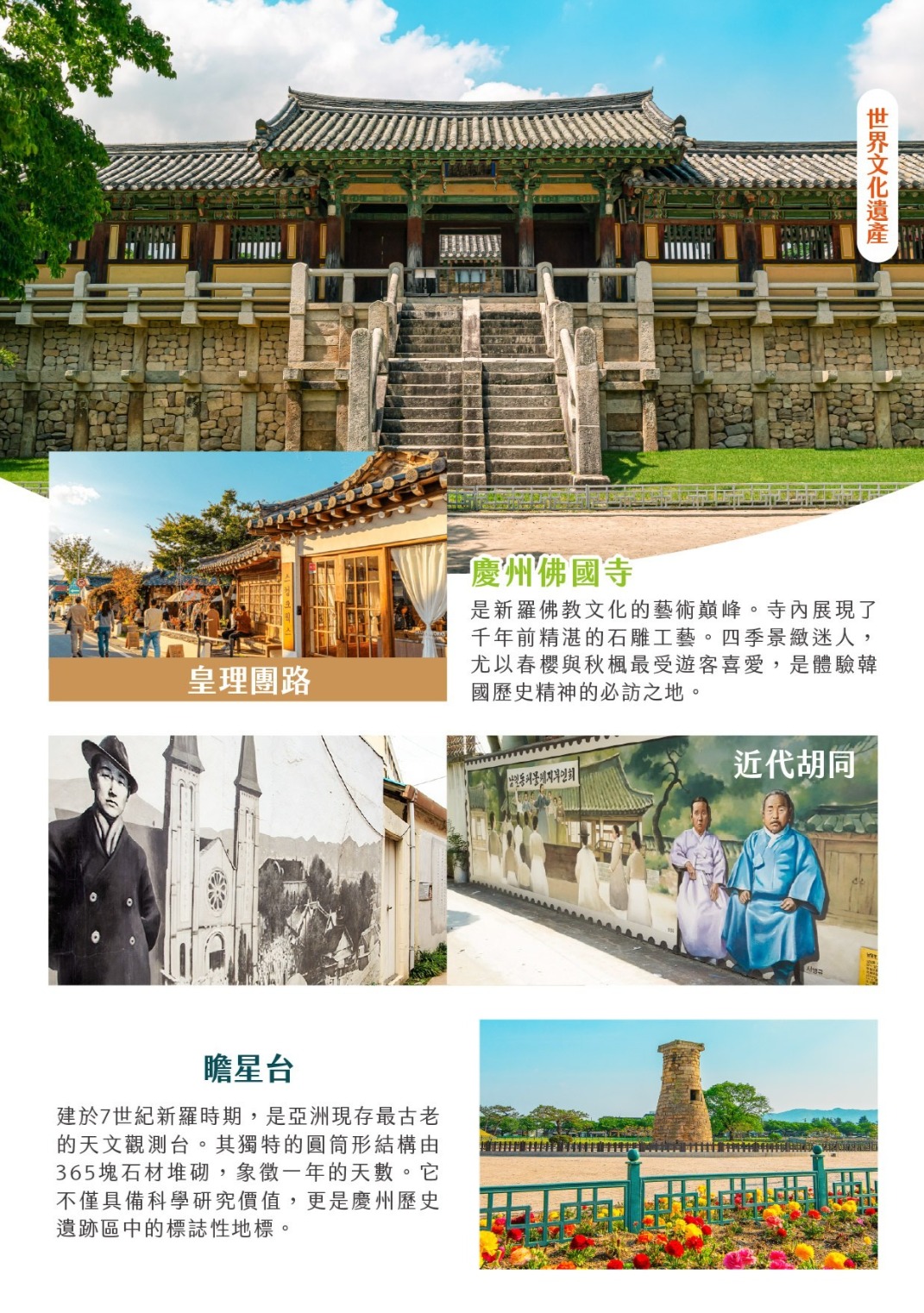 飯店→慶州佛國寺(世界文化遺產)→瞻星台+皇理團路散策→東宮月池+月精橋→西面鬧區→飯店-